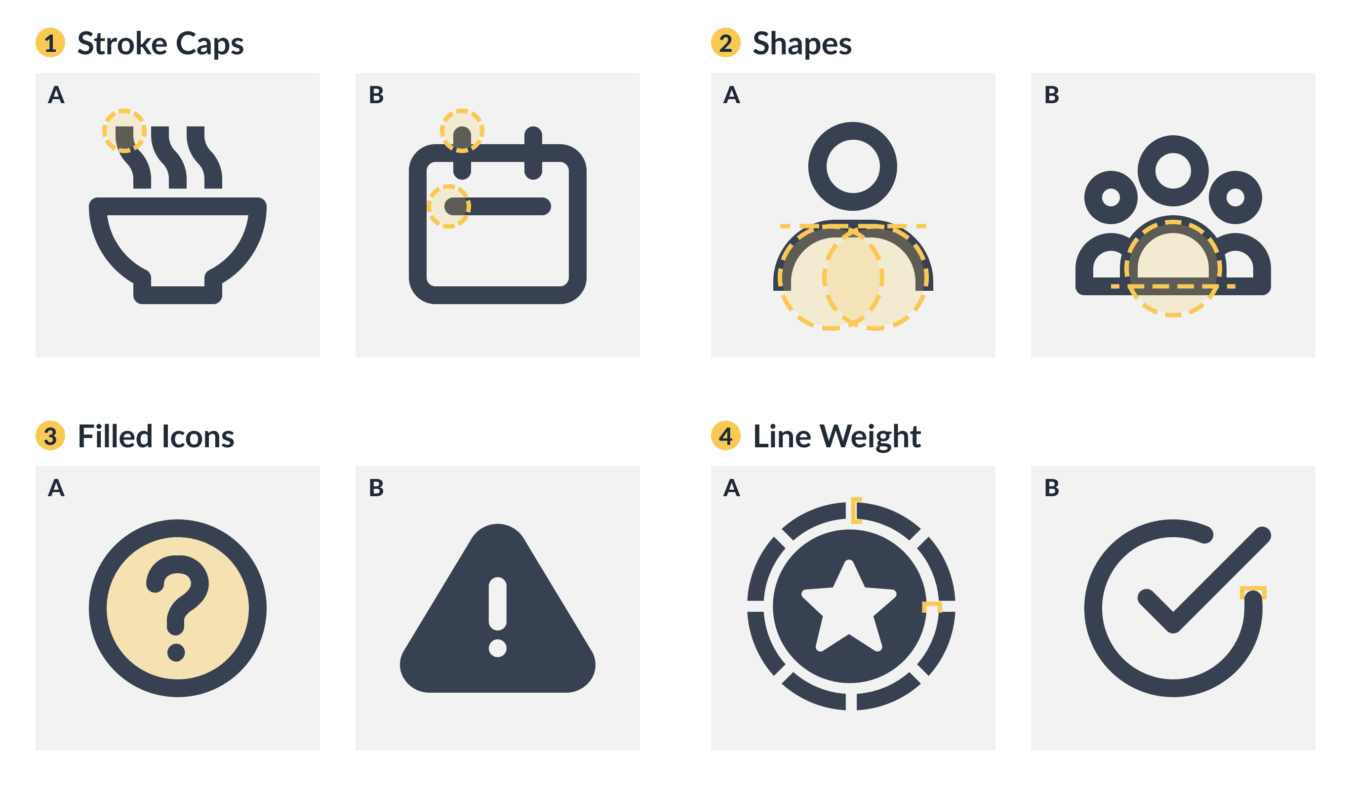I began with a thorough audit of the existing design files, live websites, and component library. The scope of the problem became clear quickly. Beyond the known accessibility failures, the icon set alone had four distinct issues: inconsistent stroke caps (some round, some square), varying fill styles within the same thematic group, line weights that deviated from the 2px standard, and size increments that ignored the established spacing scale.