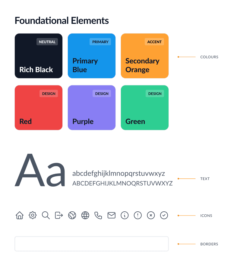 Researching well-regarded design systems - including those from major product companies - helped establish a benchmark. The patterns were consistent across the best systems: icons with uniform line weight and size, type scales with clear visual hierarchy, colours used with semantic intent, accessibility treated as a requirement rather than a retrospective check, and design tokens as the connective tissue holding everything together.