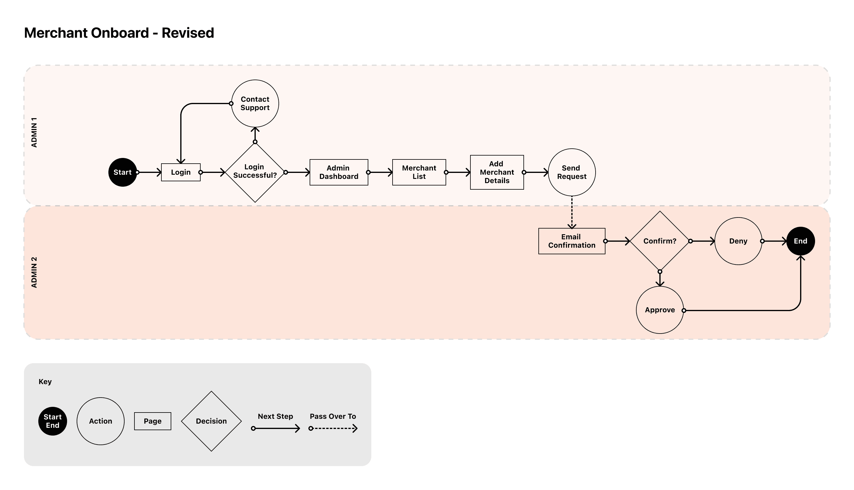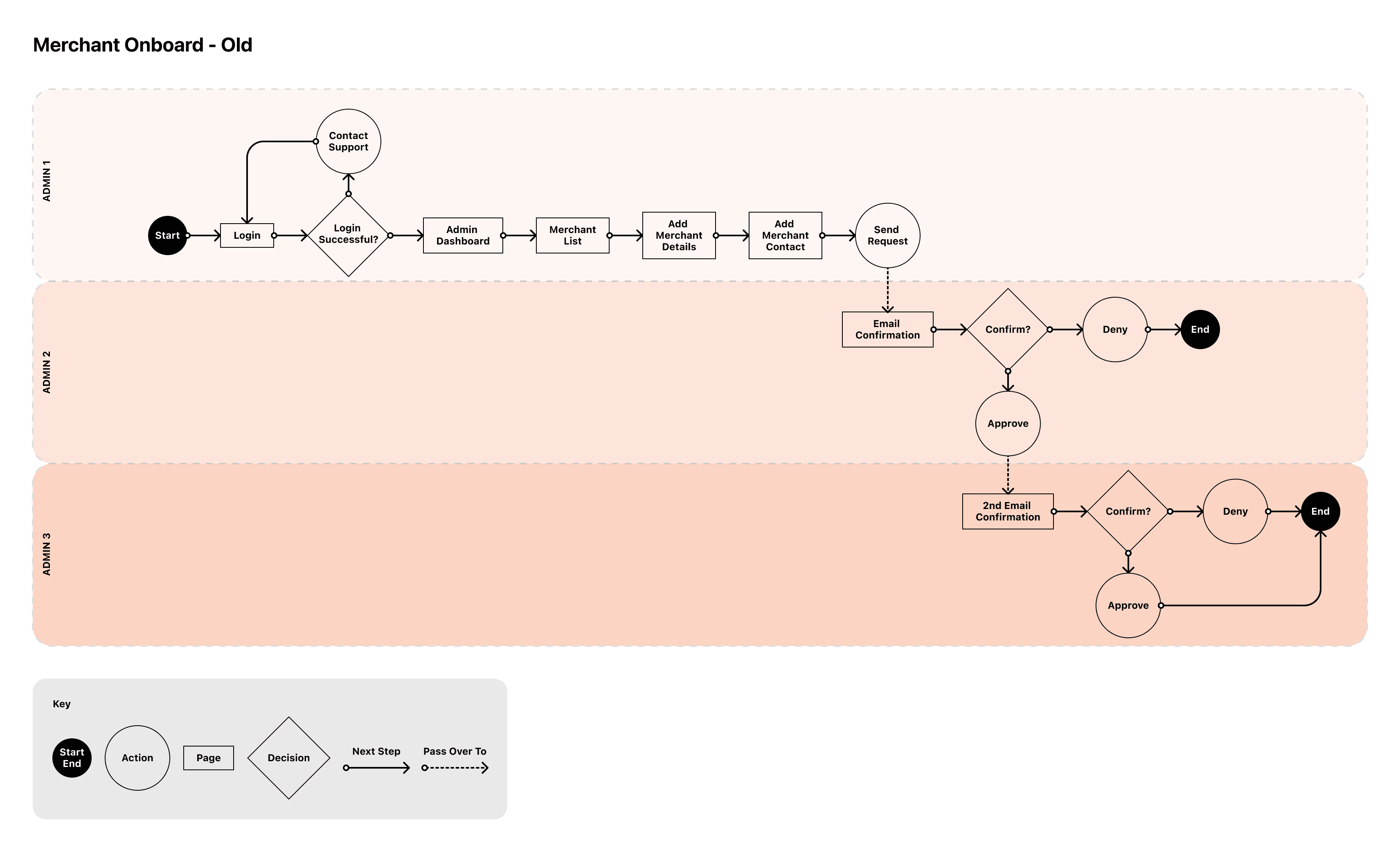 Figure 1. Original onboarding flow that involved 3 admins to fully onboard a new merchant.
