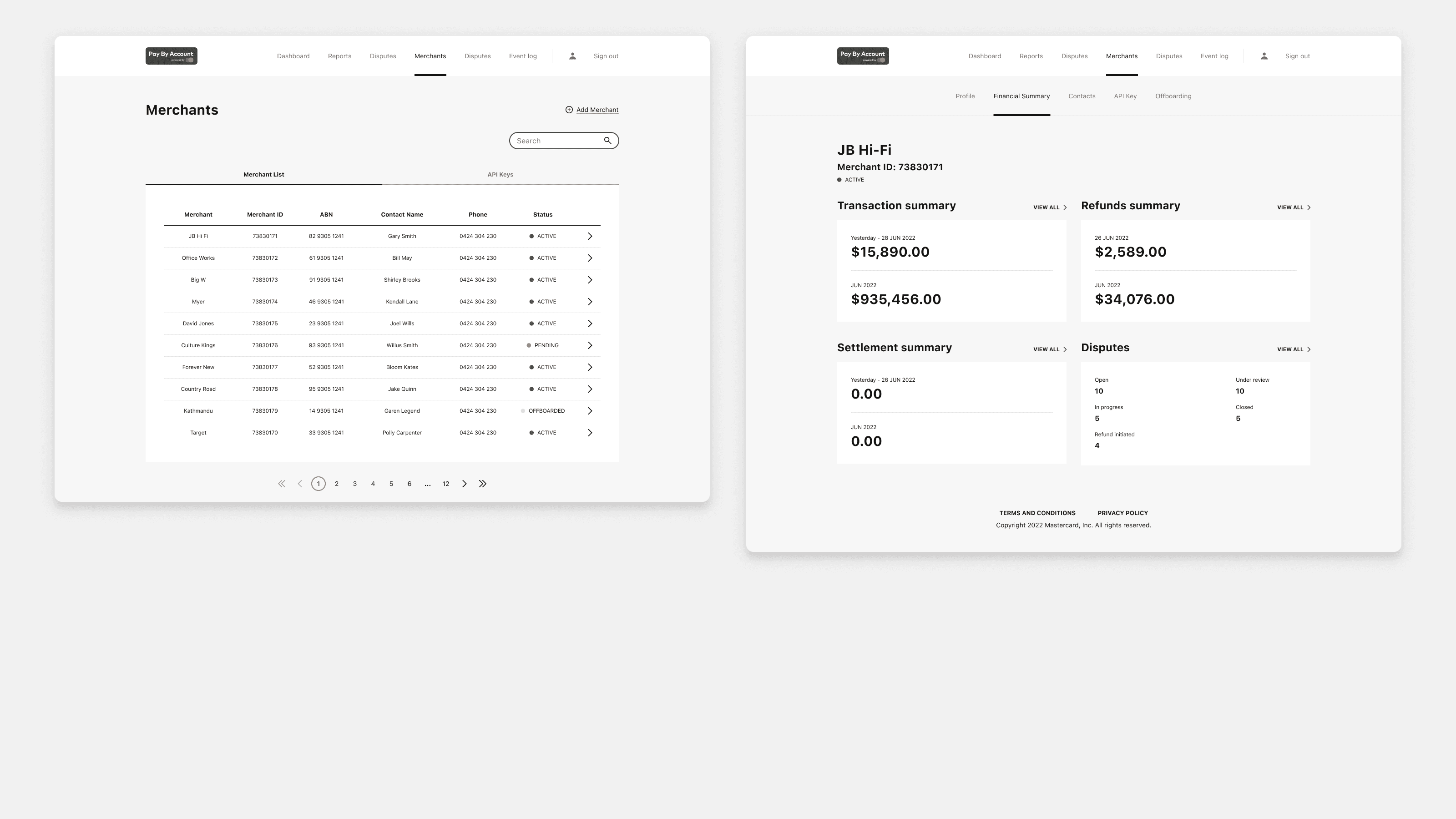 The high-fidelity Figma prototypes were well received by the Mastercard client team, and all design deadlines were met. Stakeholder testing showed users could navigate the portals and complete key tasks without friction. Completed flows included reviewing merchant accounts, onboarding and offboarding merchants, dispute management, and API key generation. The experience across all three portals was reviewed and confirmed as consistent.